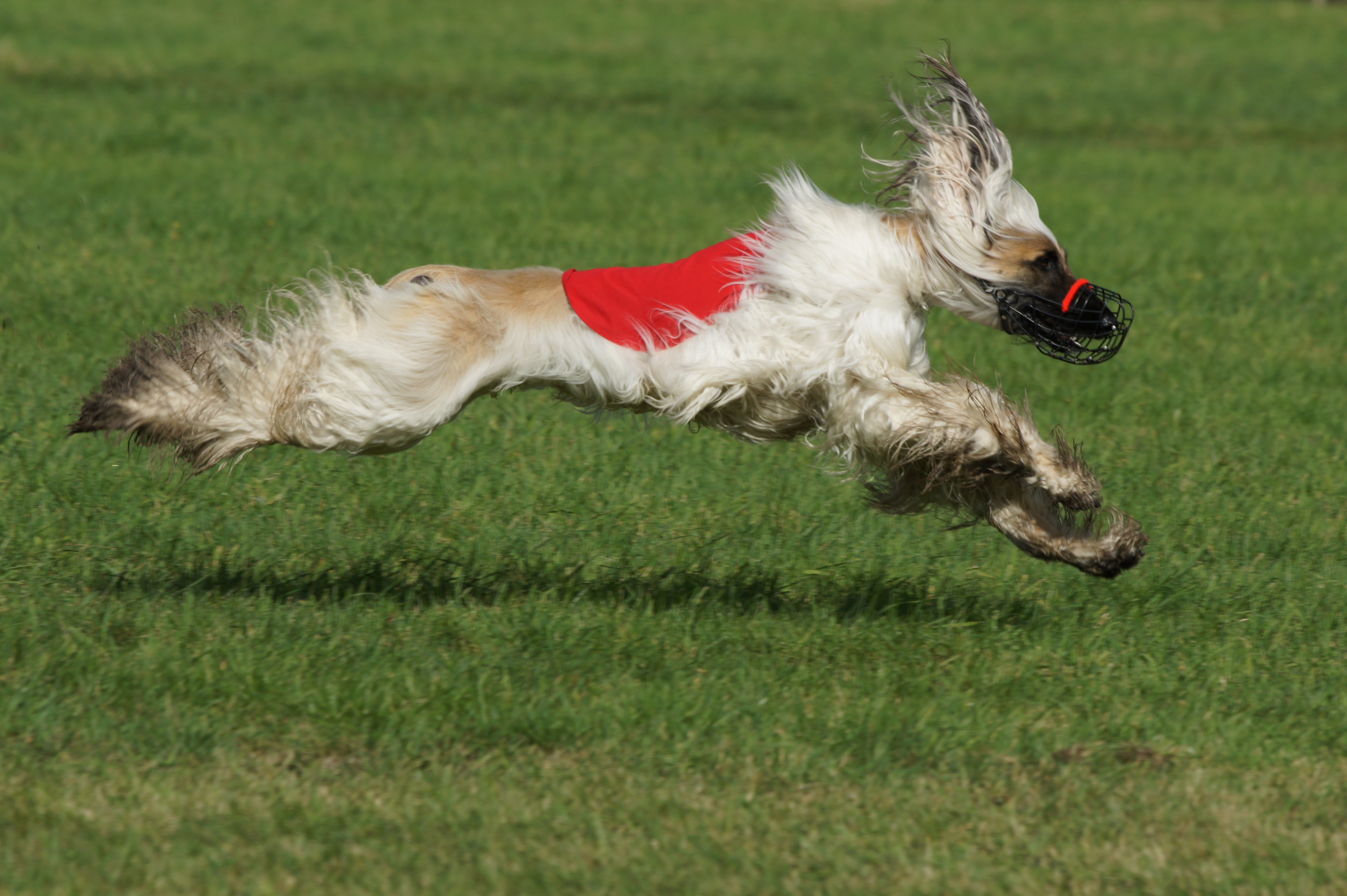 Afghaanse Windhond tijdens coursing. Bij coursing rennen de windhonden achter een haasje (plastic flappen).