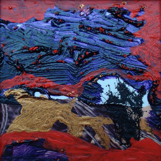 acryl op papier in combinatie met aanvullende middelen + collage. Ingelijst in passe-partout + lijst