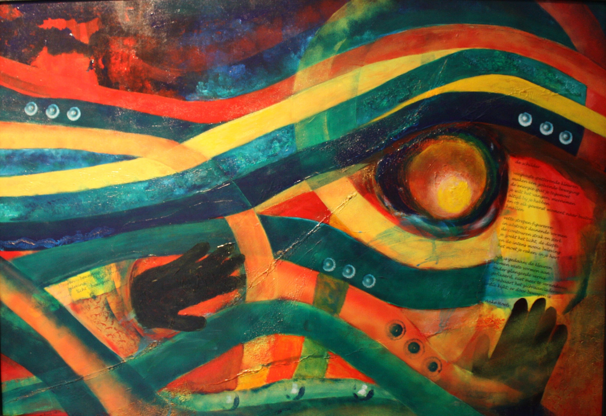 schilderij naar aanleiding van gedicht 'de schilder'. Het gedicht is geintegreerd in het schilderij.