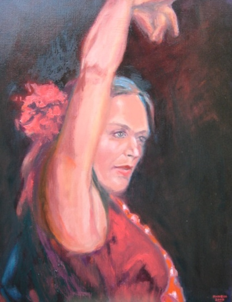 Flamenco danseres rood zwart met arm omhoog. Geschilderd in olieverf op linnen doek 70x90 cm.