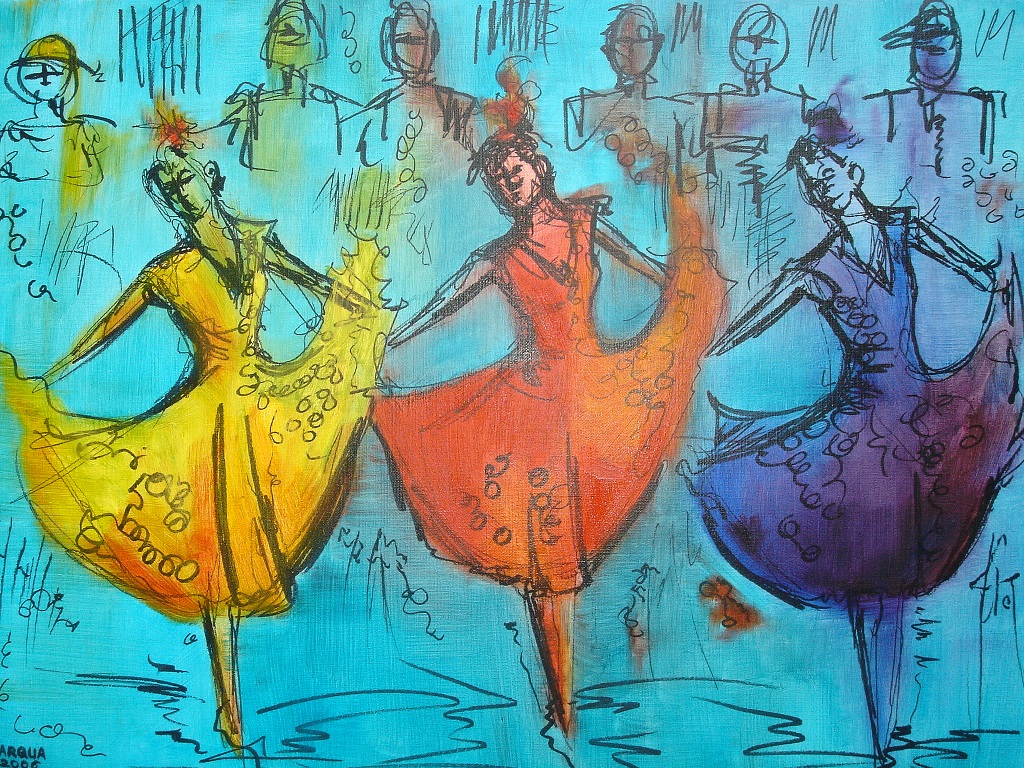 Carpe Diem, danseressen geschilderd in olieverf met lijnenspel op linnen doek 60x80 cm.