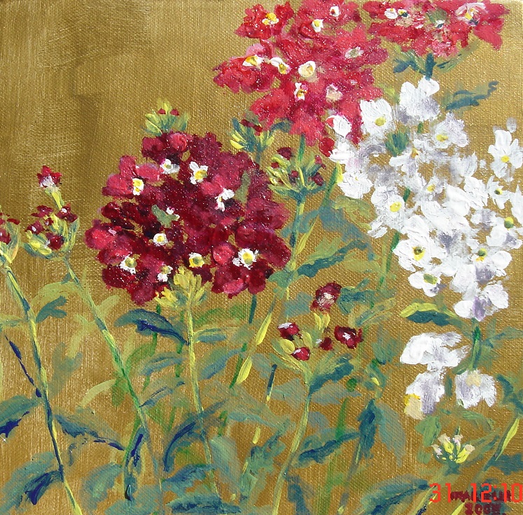 Fijne tere bloemen op een gouden ondergrond, geschilderd in acrylverf en goudverf op een "3-d" doek 25x25x4 cm.