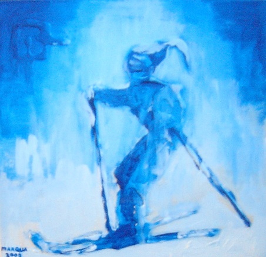 Persoon op de skilatten, geschilderd in acrylverf en gemengde technieken op "3-d" doek 30x30x4 cm. Duidelijk zichtbaar reliëf. Eventueel te combineren met schilderijtjes sporters of muzikanten, gemaakt op dezelfde manier.