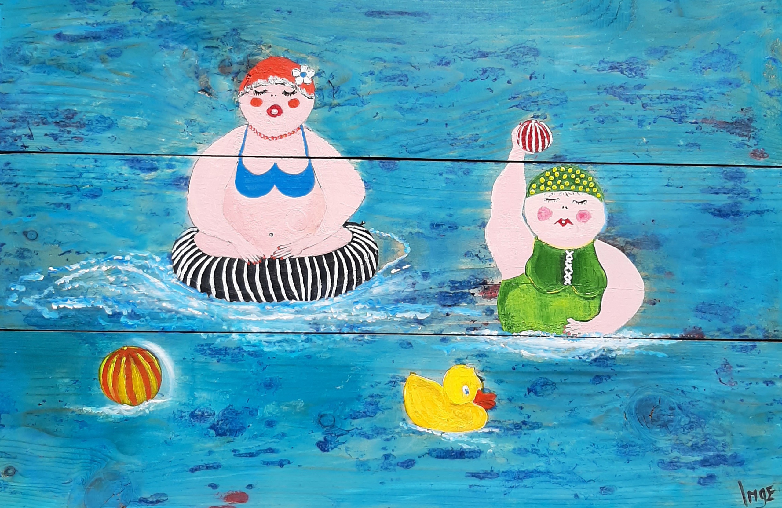 Dikke Dames sportief in het zwembad Leuk schilderij op hout handgeschilderd (met een dikke knipoog) in kleurrijk acryl