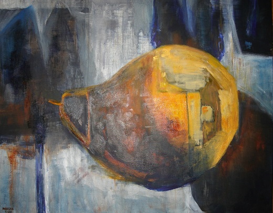 Grote peer en tulpen, geschilderd in acrylverf op doek 80x100 cm.