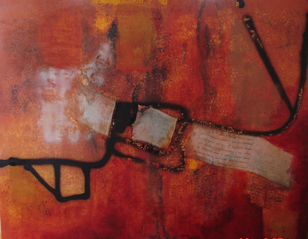 "The Message", geschilderd in acrylverf, stof, gemengde techniek en gespoten verf uit spuitbus op linnen doek 80x100 cm.