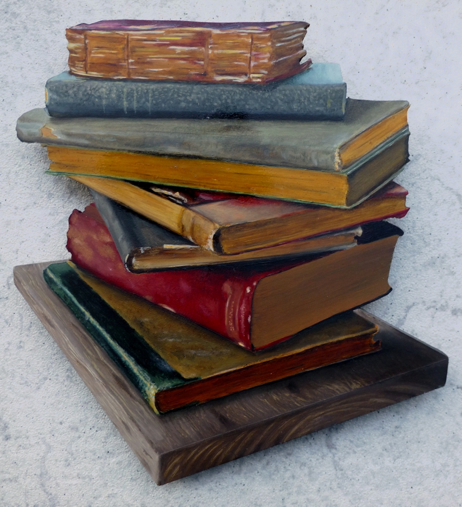 Stapeltje leesvoer uit de 'oude doos' (op een uitgezaagd paneel)