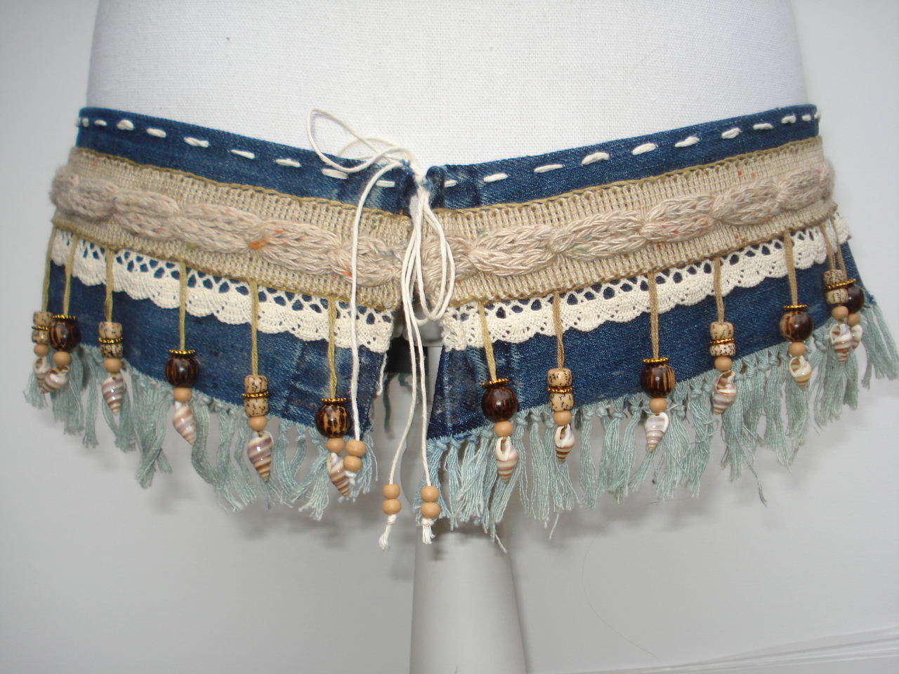 Handgemaakt met 100% natuurlijk materialen. Gebruikte kralen bestaan uit schelpjes, pitten, hout en goudkleurig metaal. Borduurdraad en keukentouw zijn verwerkt in gerafelde spijkerstof voorzien van een band in kabelmotief van wol met daaronder kant van katoengaren.