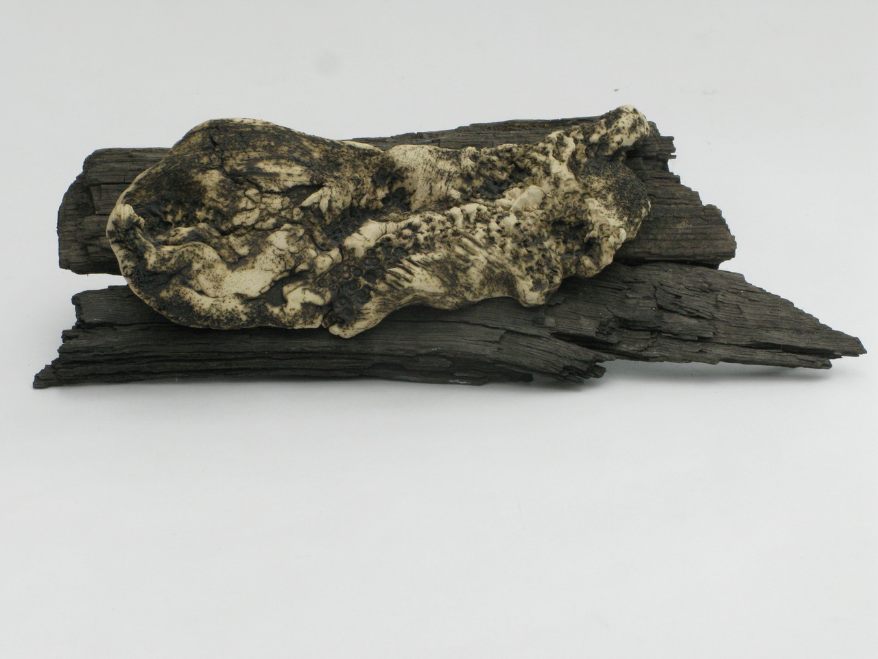 "Oud en verweerd" (keramiek met oxides, gecombineerd met kienhout).