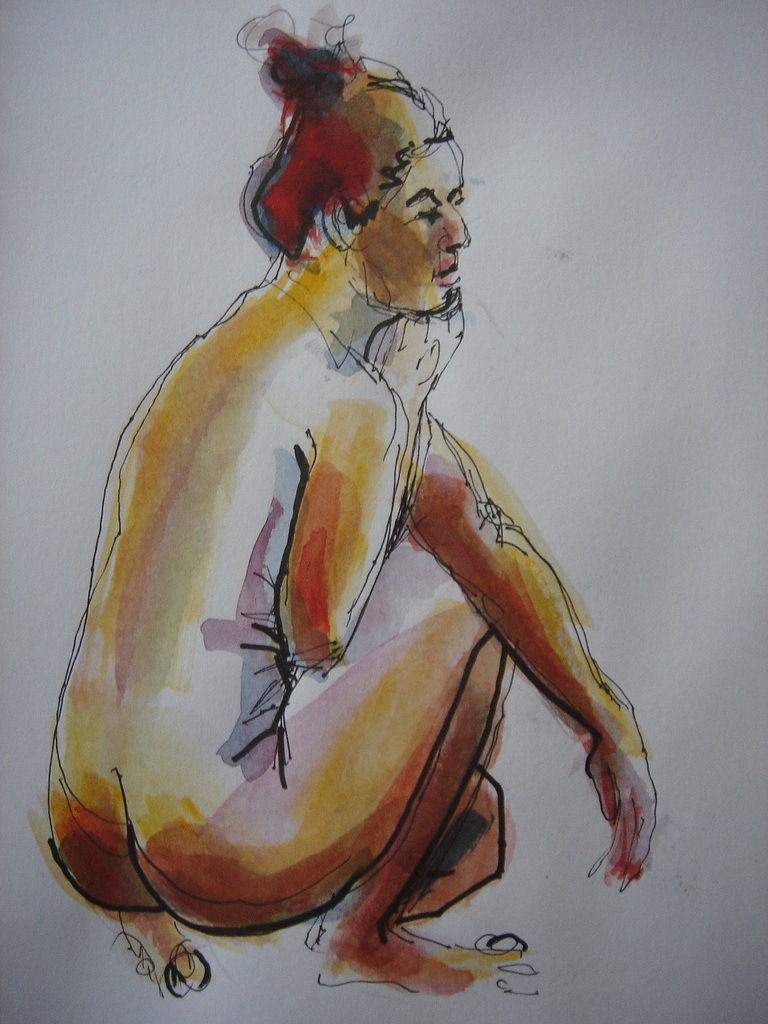 Naakte vrouw gehurkt, getekend met tekenpen en geschilderd met aquarelverf op papier ca. 30x40 cm. Rood, geel, oranje, bruin, blauw, paars, wit, en gebrande siënna.