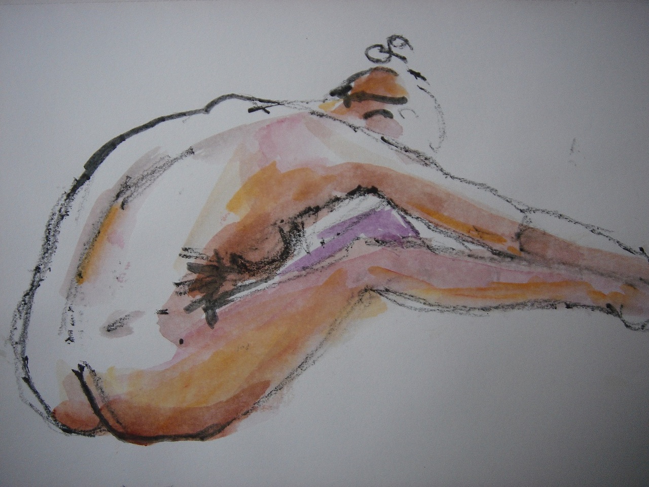 Naakte vrouw voorover zittend, getekend met aquarel klimt en geschilderd met aquarelverf op papier 21x30 cm. Roze, paars, oranje, bruin, lila, zwart en wit. Honderden schetsen op voorraad!