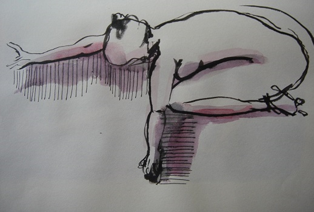 Wit Zwart Paars Vrouw Roze Zittend Voorover Naaktmodel Aquarelverf Tekenpen Marion Janssen Quaadvliet