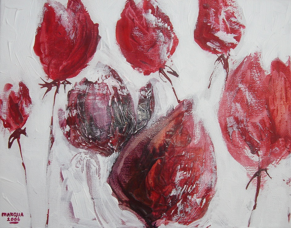 Kleine tulpachtigen in encaustiek/bijenwas en geschilderd in olieverf op doek 24x30 cm. Rood, wit, zwart Bloemen.