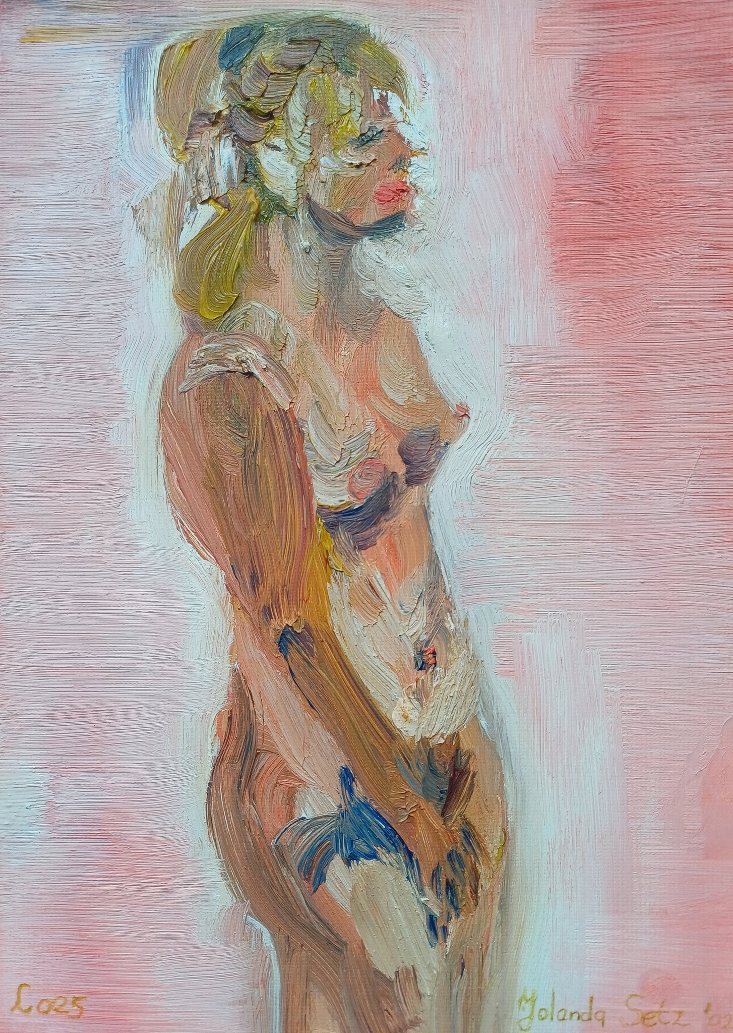 Dit fijn olieverf schilderij laat Loes zien, een model 'life' geschilderd na lange tijd model gestaan te hebben voor ons, kunstenaars. Loes had een bepaalde uitstraling, die als een wit licht om haar heen te zien was. Dat licht heb ik ook geschilderd.