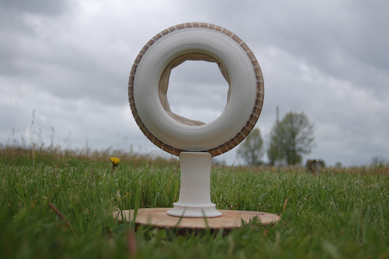 Gedraaide ring van Porseleinklei met zwarte kleislib en waterglas behandeld, waardoor de scheuren in de buitenrand en plooien in de binnenrand zijn ontstaan, op een gedraaide Porseleinen voet. Hoog gebakken, vorstbestendig