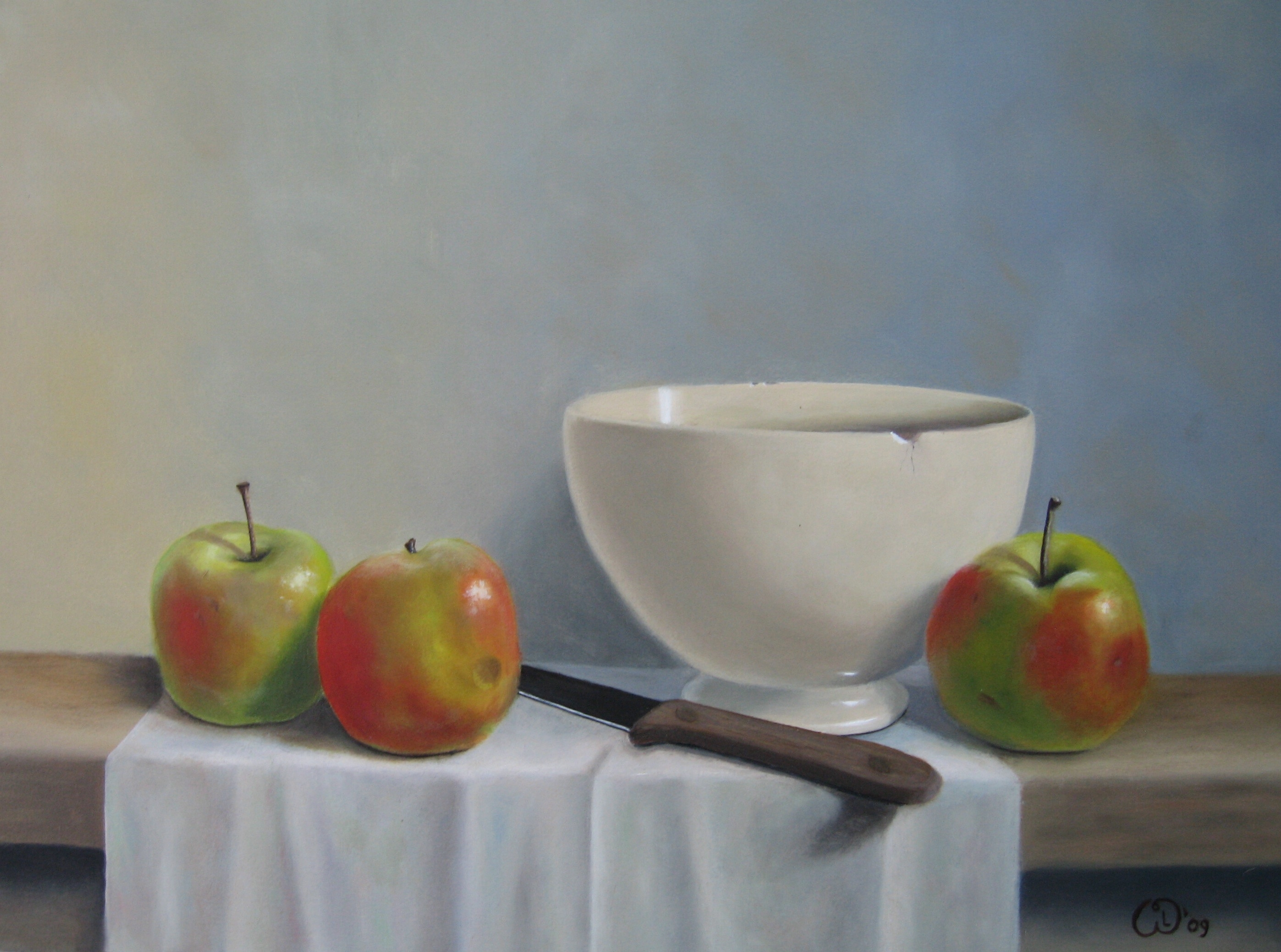 Olieverf Paneel Stilleven Kom Witte Appels Kleedje