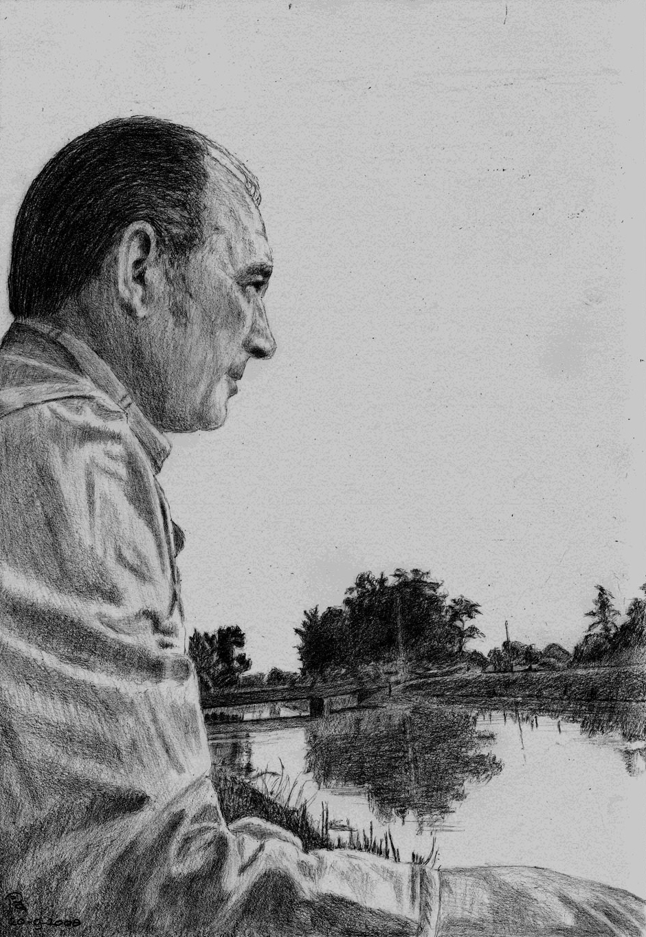 Landschap Man Water Potlood Realistisch Bomen Vissen Het Brug Aan Vader Beek Stil Opa Waterkant Pa Hengelsport Mannenportret Hengelen