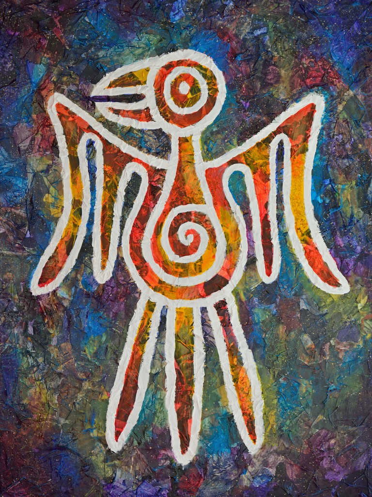 De Maya's zijn een volk dat leefde in centraal Amerika en hun bloeitijd hadden rond het jaar 700. Ze gebruikte karakteristieke symbolen om te communiceren, waaronder vogelfiguren. De adelaar komt veel voor in de overleveringen. Dit schilderij is gemaakt door eerst papier te plakken op het canvas om structuur te creëren. Daarna heb ik dit beschilderd met acrylverf. Door de grove structuur lijkt het een rotsschildering. De heldere kleuren geven het geheel een modern uiterlijk. Op 4 cm dik 3D doek. Ook als print verkrijgbaar.