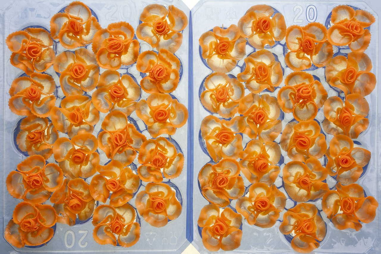 door chinees-indische restauranthouder uit wortel gesneden rozen op geometrisch abstracte wijze gepresenteerd.