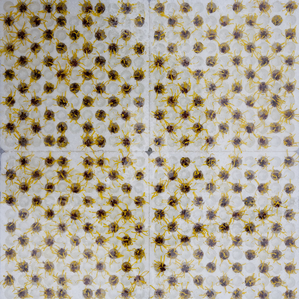 hamamelis of toverhazelaar eerste lentebode. De presentatie van de bloemetjes is hier abstract geometrisch geordend