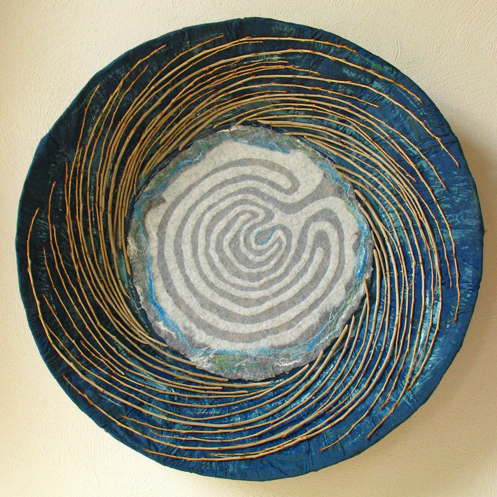 Labyrint gemaakt van wol, zijde en populierenloten. 1 meter doorsnee LEVEN VANUIT DE BRON Terugkeren Verlangen naar nieuwe kracht Eerst naar binnen gaan Water-Kracht-Geest-Leven! Stilte vind ik in het hart Daar voedt de Geest Inspiratie bruist in mij op De Geest stuurt mij op pad Ik mag stromen Doorgeven……. Leef vanuit die Bron