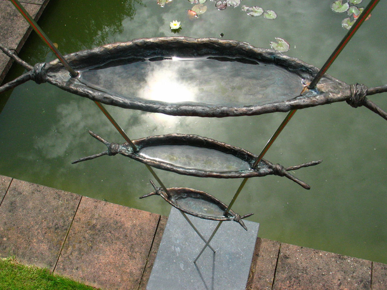RVS met brons. Als watervanger en de vogels kunnen zich erin badderen.