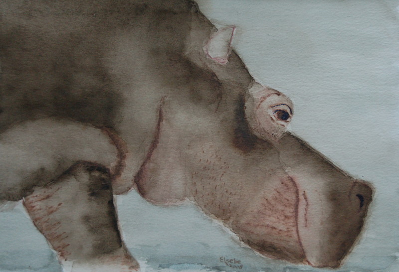 Aquarel Dier Portret Nijlpaard Papier Potlood Gemengde Technieken