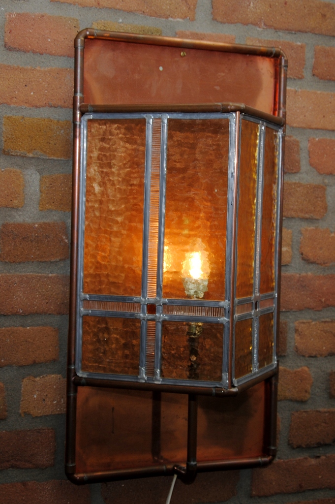 Wandlamp uitgevoerd in koper met glas in lood.