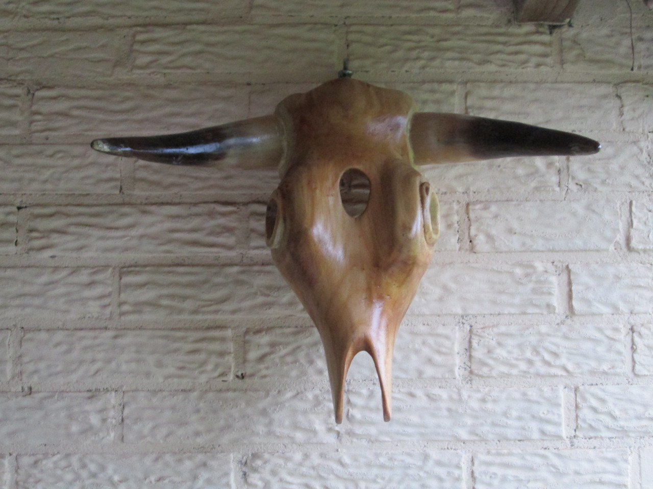 Deze schedel is gehakt uit een wilg en daarna zijn deze hoorns bevestigt