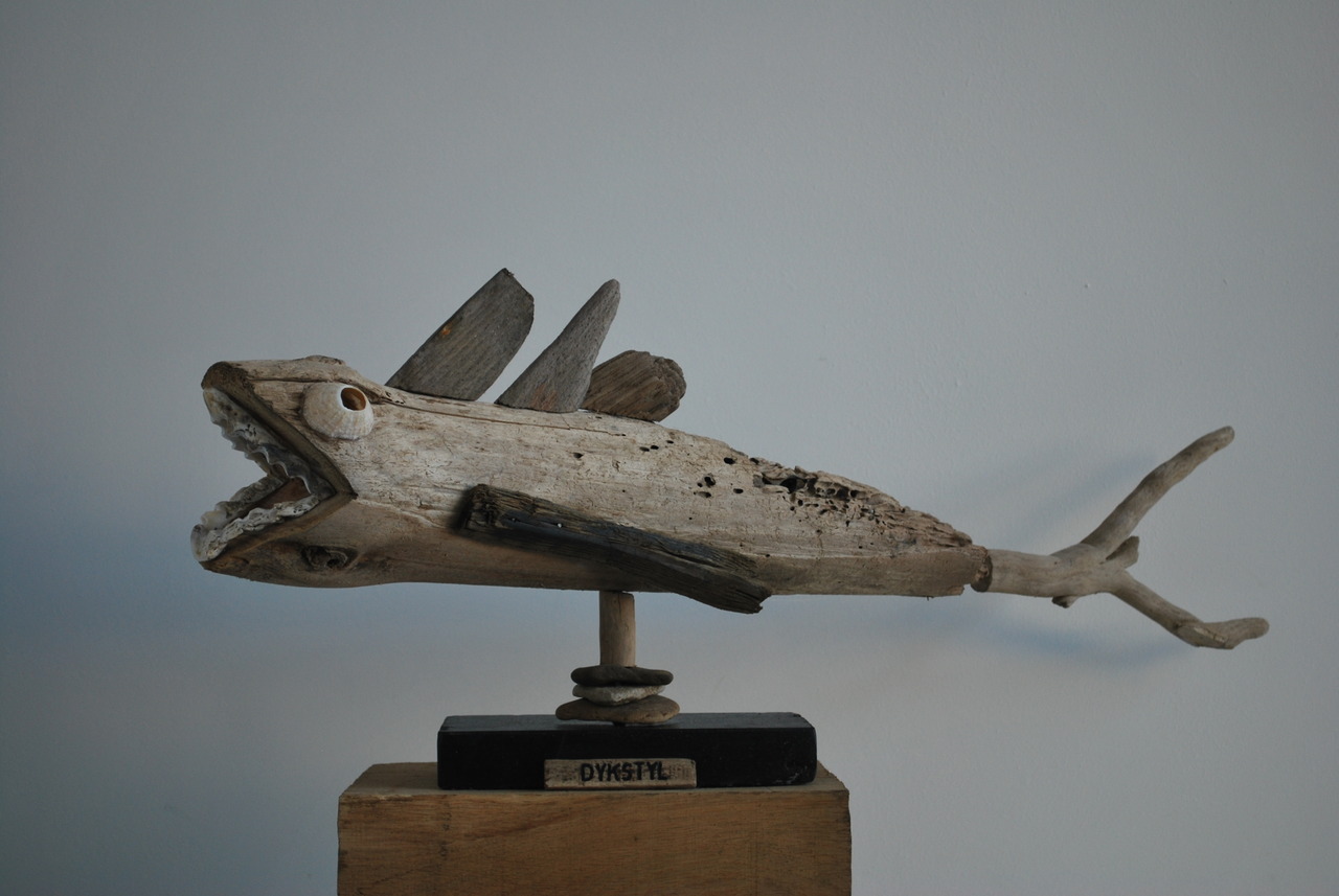 maakt al jaren houten beelden door natuurlijke objecten uit zee te koppelen. De beelden zijn ruw en puur.