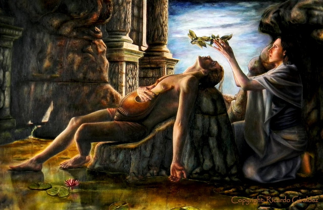 Oil Painting Figurative Symbolism Man Poet Homer Lyre Laurel Requiem Glory Immortality Wife Muse Draping Legend Ancient Columns Porch Stone Rock Pond Water Lilies Flower