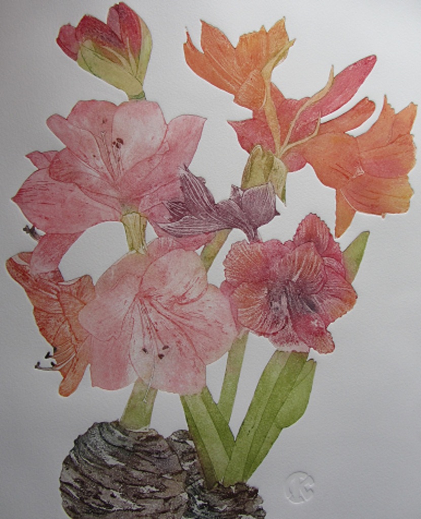 Midden in de winter staan er bij mij altijd amaryllissen te bloeien, zelf uit de bol getrokken. Wat een kleurenpracht!! Fantastische kleurschakeringen, zachte tinten tegenover felrood. Daar moest een ets van komen. De hele ets is op vorm gezaagd, waardoor het papier ook werkelijk wit er omheen is. Deze ets heeft echt veel weg van een aquarel! oplage: 50