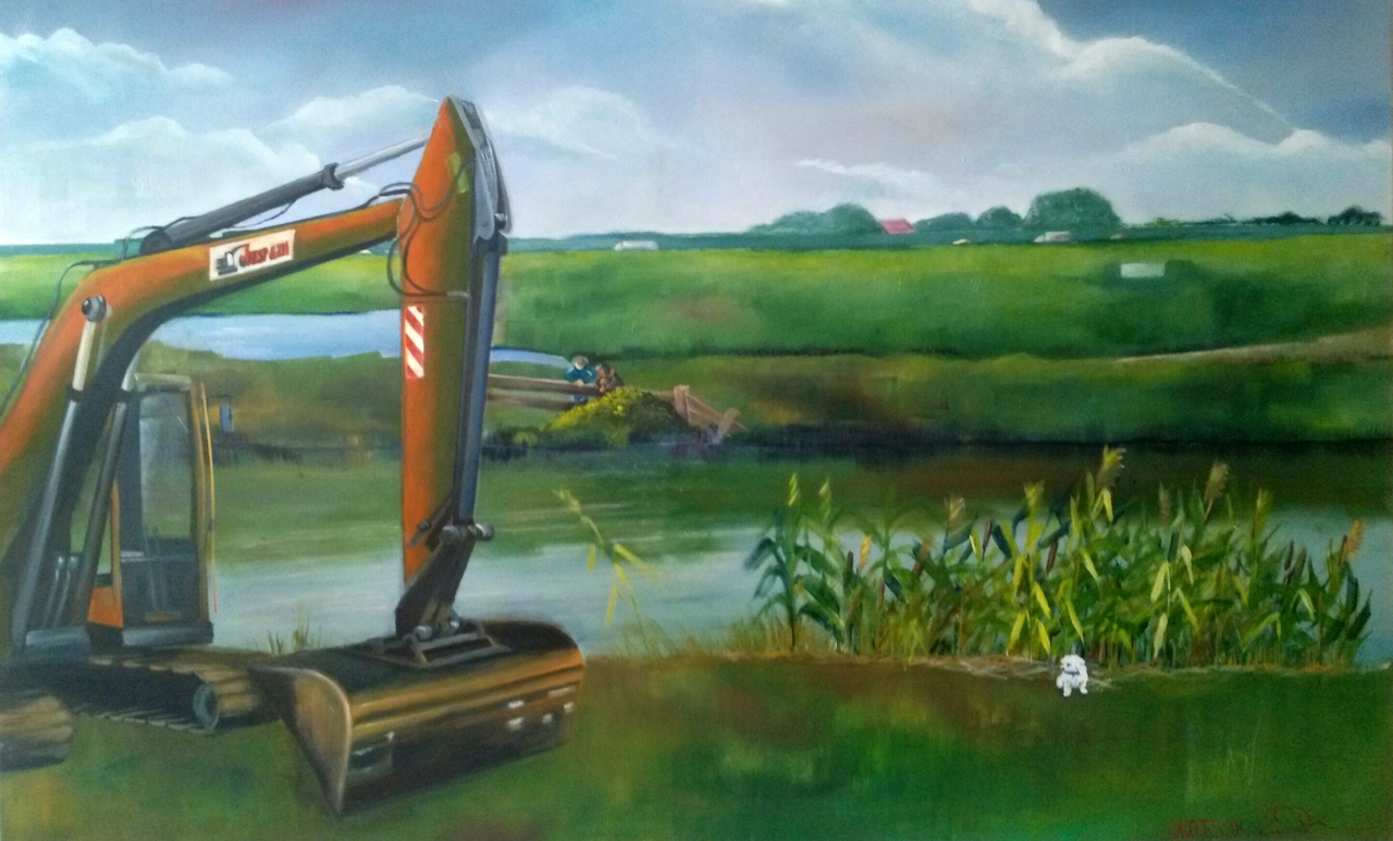 Landschap Groen Man Olieverf Groot Weg Dijk Sloot Kraan