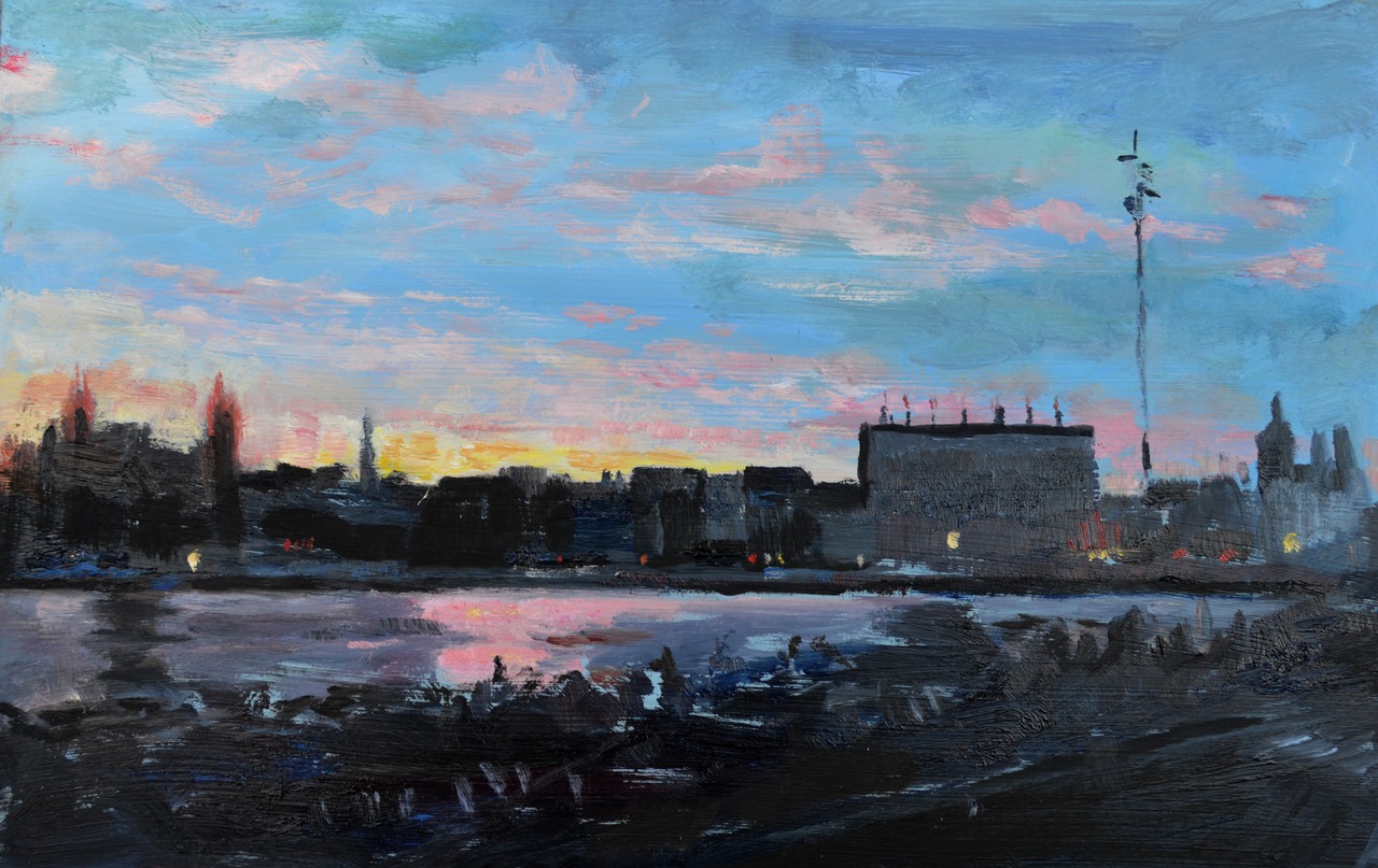 Blauw Sunset Zonsondergang Amsterdam Roze Stadsgezicht Impressionistisch Toets Losse