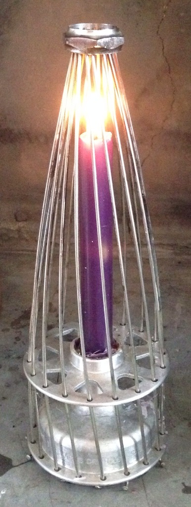 Kandelaar gemaakt uit aluminium trommelremnaaf en roestvrijstalen spaken.