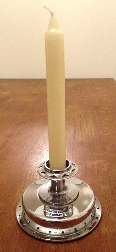 Kandelaar gemaakt uit verchroomde trommelremnaaf.