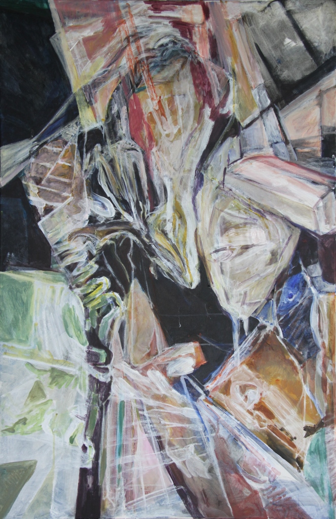 Het schilderij is opgebouwd uit schijnbaar willekeurige elementen die naar een gemeenschappelijk punt lijken te bewegen of vallen.