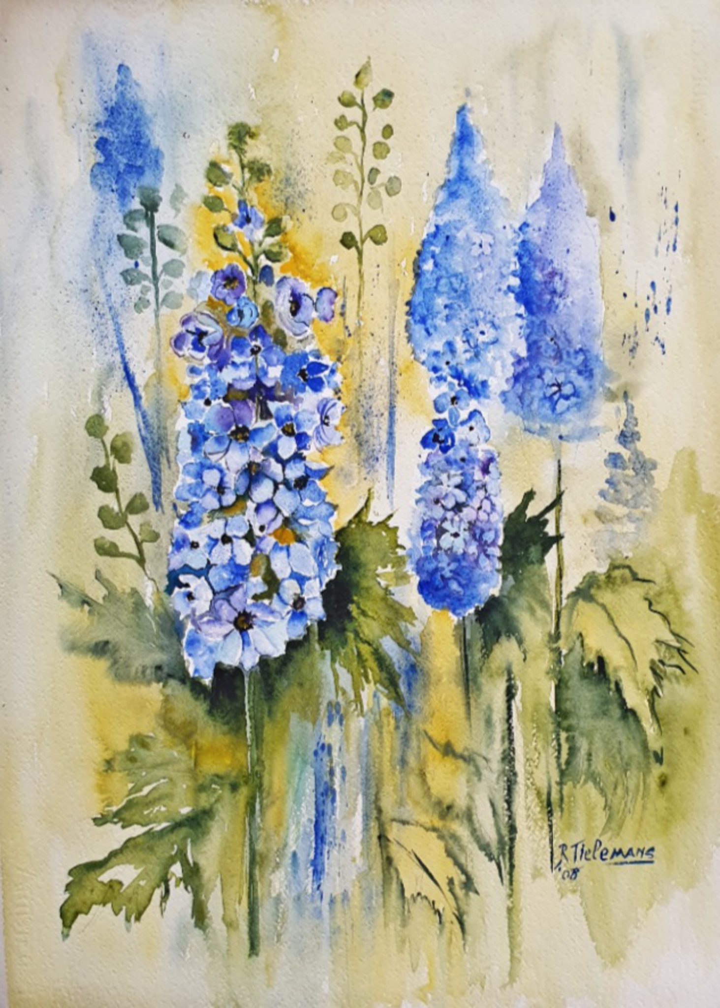 . Deze aquarel toont blauwe ridderspoor, opgebouwd in transparante lagen met nat-in-nat technieken en losse, verticale penseelstreken. De bloemen zijn met geconcentreerde pigmenten aangezet, terwijl de achtergrond bestaat uit zachte wassingen van groen en geel, waardoor diepte ontstaat zonder harde contouren. Het kleurgebruik is helder maar sober gehouden, met subtiele overgangen tussen licht en schaduw. De compositie is bewust open gelaten: vormen worden gesuggereerd in plaats van uitgewerkt, wat het werk een luchtige en spontane uitstraling geeft. De schildering focust op kleurwerking en beweging eerder dan op botanische detaillering.
