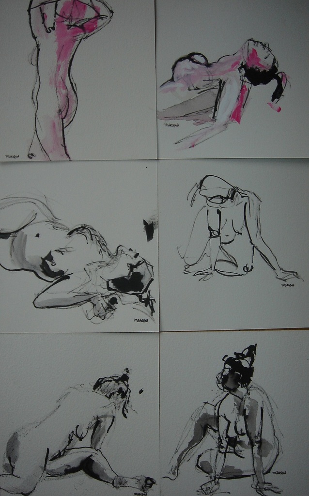 Zes maal naakte vrouw, getekend en geschilderd in Oost-Indische inkt en aquarelverf op speciaal dik papier (soort karton) ca. 20x20 cm. Eventueel per stuk á €25 te koop.