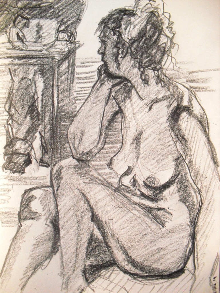 zittend vrouwelijk naakt, kijkend naar een tekenaar