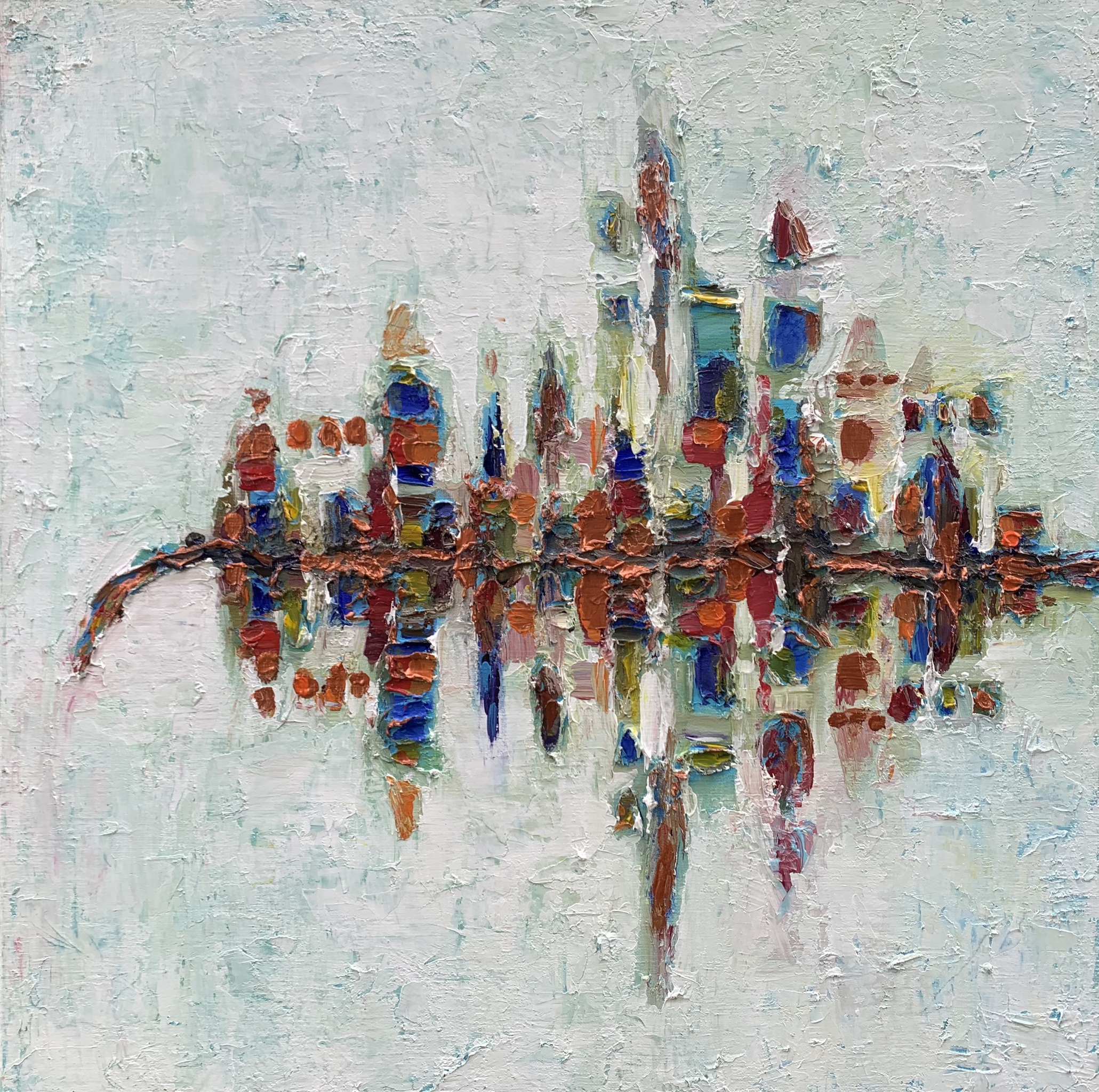 Skyline, geschilderd in acrylverf en gemengde technieken met duidelijk zichtbaar reliëf, geschilderd op linnen doek 80x80 cm. Dikke verf en pasta.