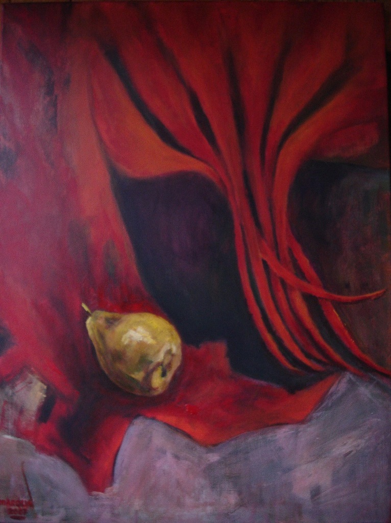 Stilleven met peer op rode achtergrond, geschilderd in acrylverf op doek 60x80 cm.