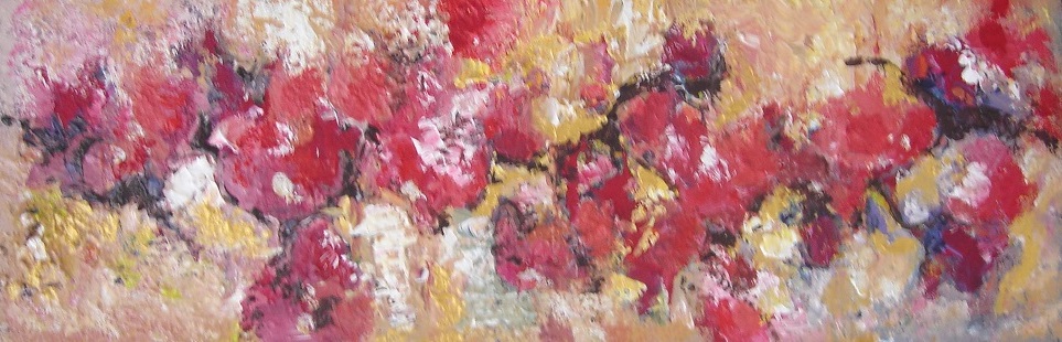 Bloemachtigen, geschilderd in acryl- en goudverf en aarde (Vughtse grond) op doek ca. 30x90 cm.