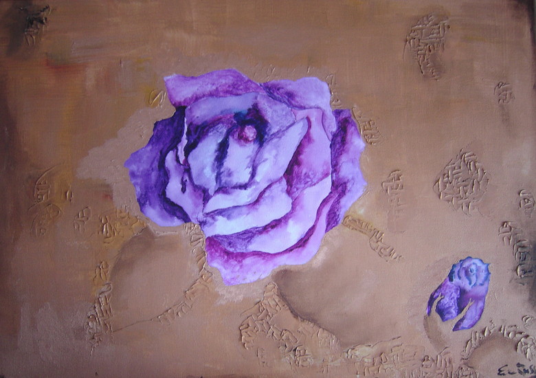 two roses made in watercolour pop out of a background made with 3dimentional pattern in a sea of Bronze