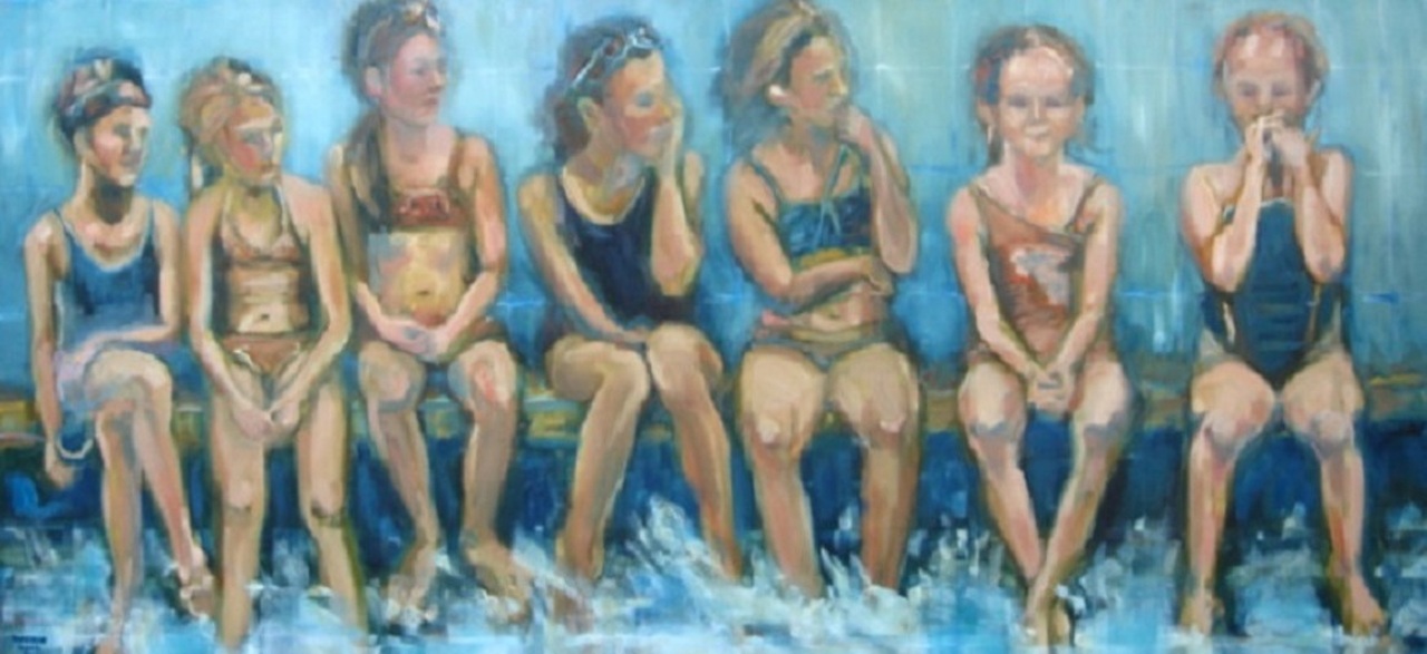 Kinderen, zeven meisjes bij het zwembad, geschilderd in olieverf op linnen doek 70x150 cm.
