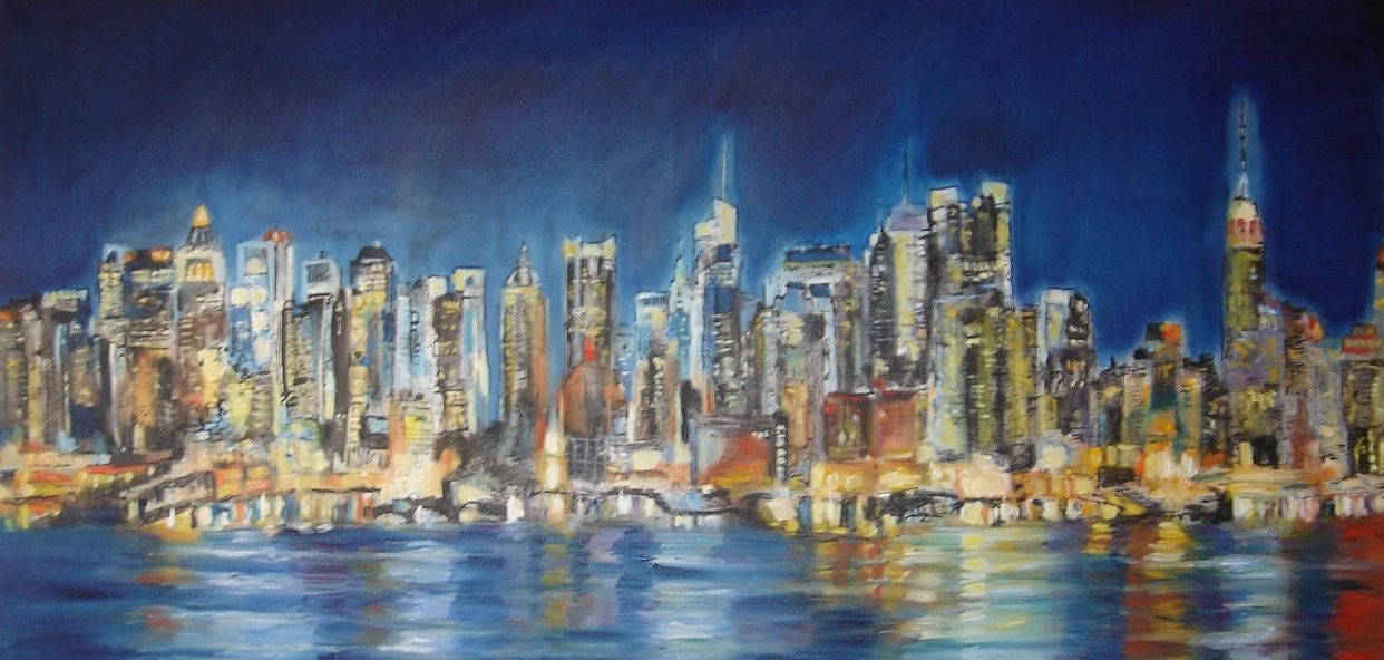 Skyline New York, getekend en geschilderd met rietpen en penseel in Oost-Indische inkt en olieverf op doek 60x120 cm.