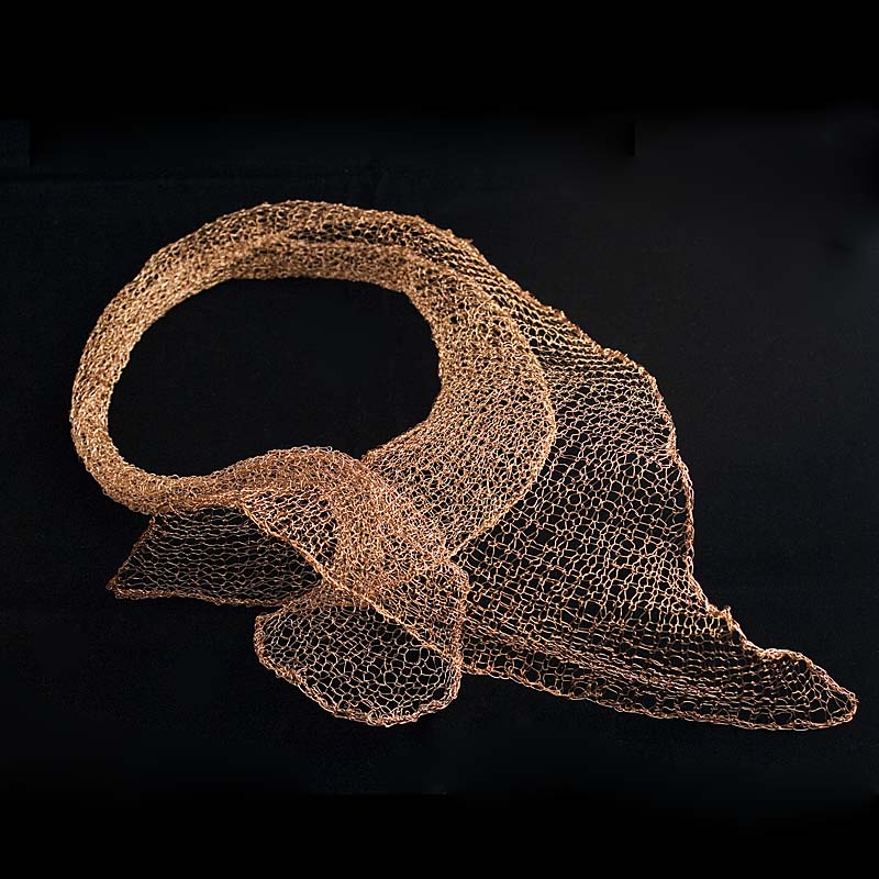 Halssieraad van gebreid dun koperdraad. Materiaal is buigzaam, en kan op verschillende manieren gedragen worden.