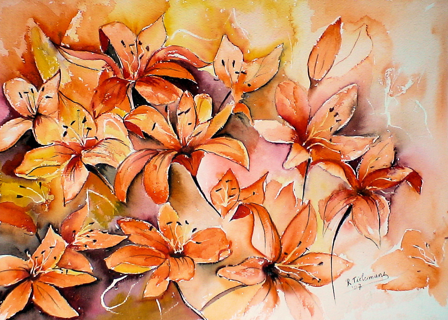 Wit Figuratief Rood Oranje Geel Papier Aquarel Realistisch Bloem Red Plant White Flower Paper Figurative Lelie Lily Orange Realistic Watercolour