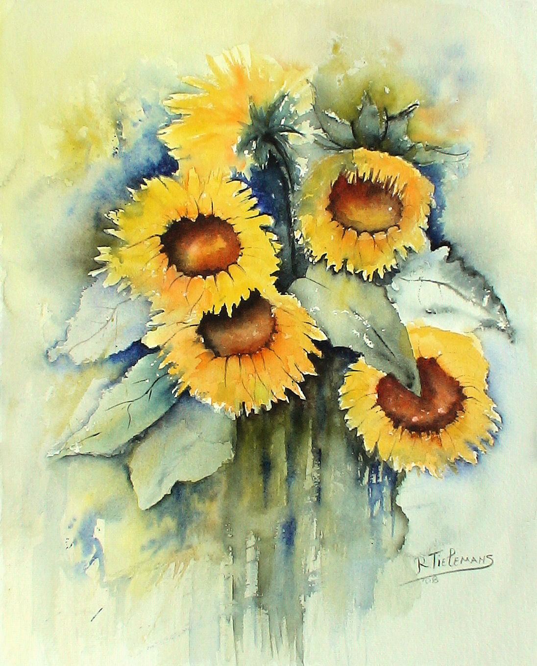 Figuratief Geel Zwart Blauw Yellow Groen Bruin Blue Papier Tuin Aquarel Realistisch Natuur Bloem Green Black Plant Brown Flower Paper Figurative Zonnebloem Garden Sunflower Nature
