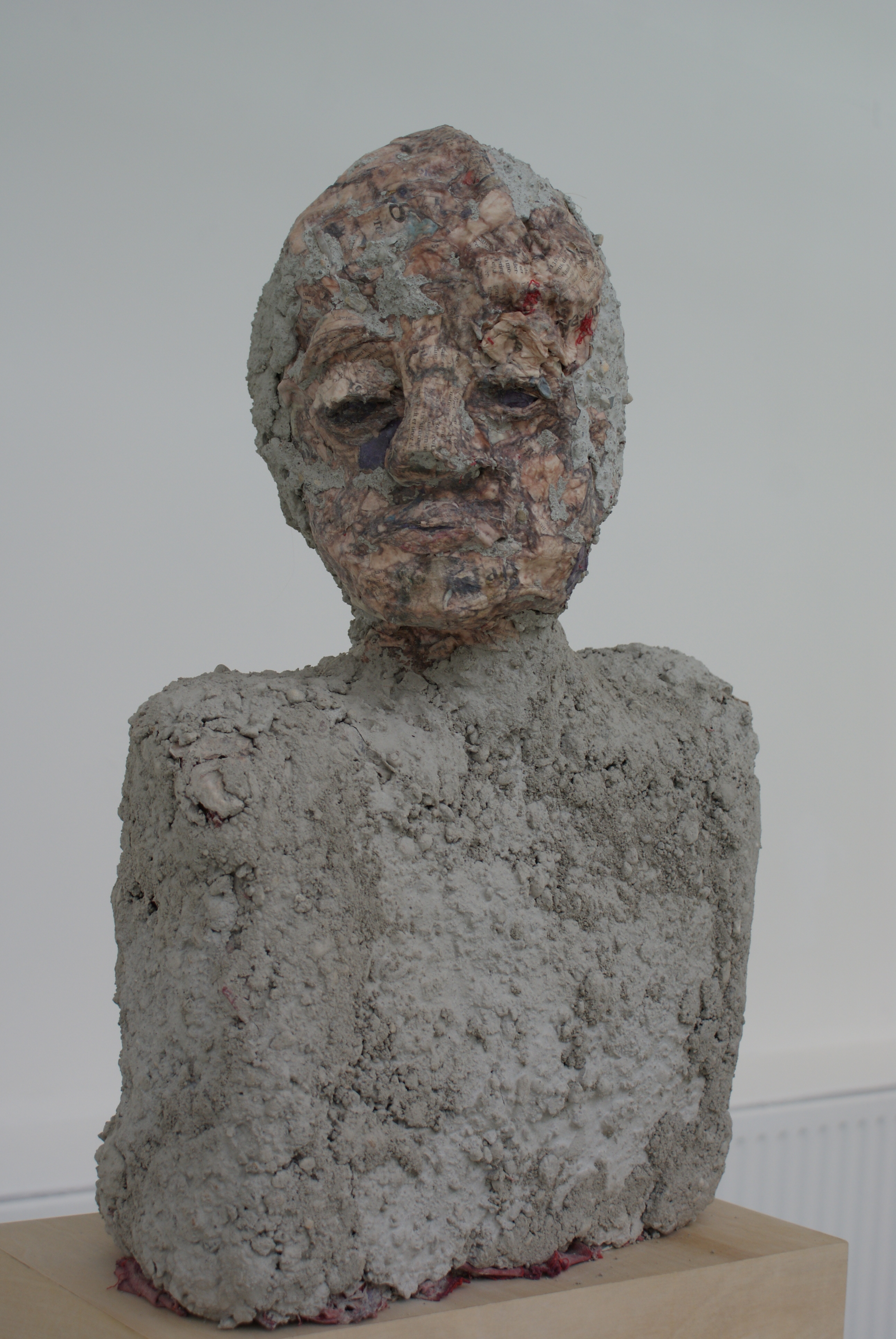 Figuur van papier maché, ingeklonken in beton. Vastzitten of vastberaden aanwezig?